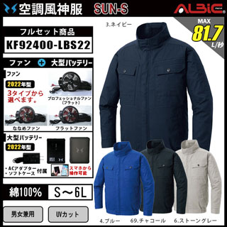 【KF92400-LBS22(12V) セット】_綿100%長袖作業服ブルゾン+ファン+日本製バッテリー2022年型set_(空調風神服)