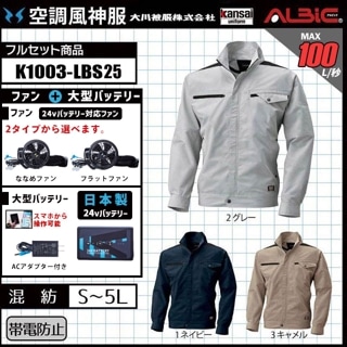 【販売終了】_【K1003-LBS25(24V) セット】_帯電防止長袖ブルゾン+ファン+日本製24Vバッテリー2025年型set_(空調風神服)